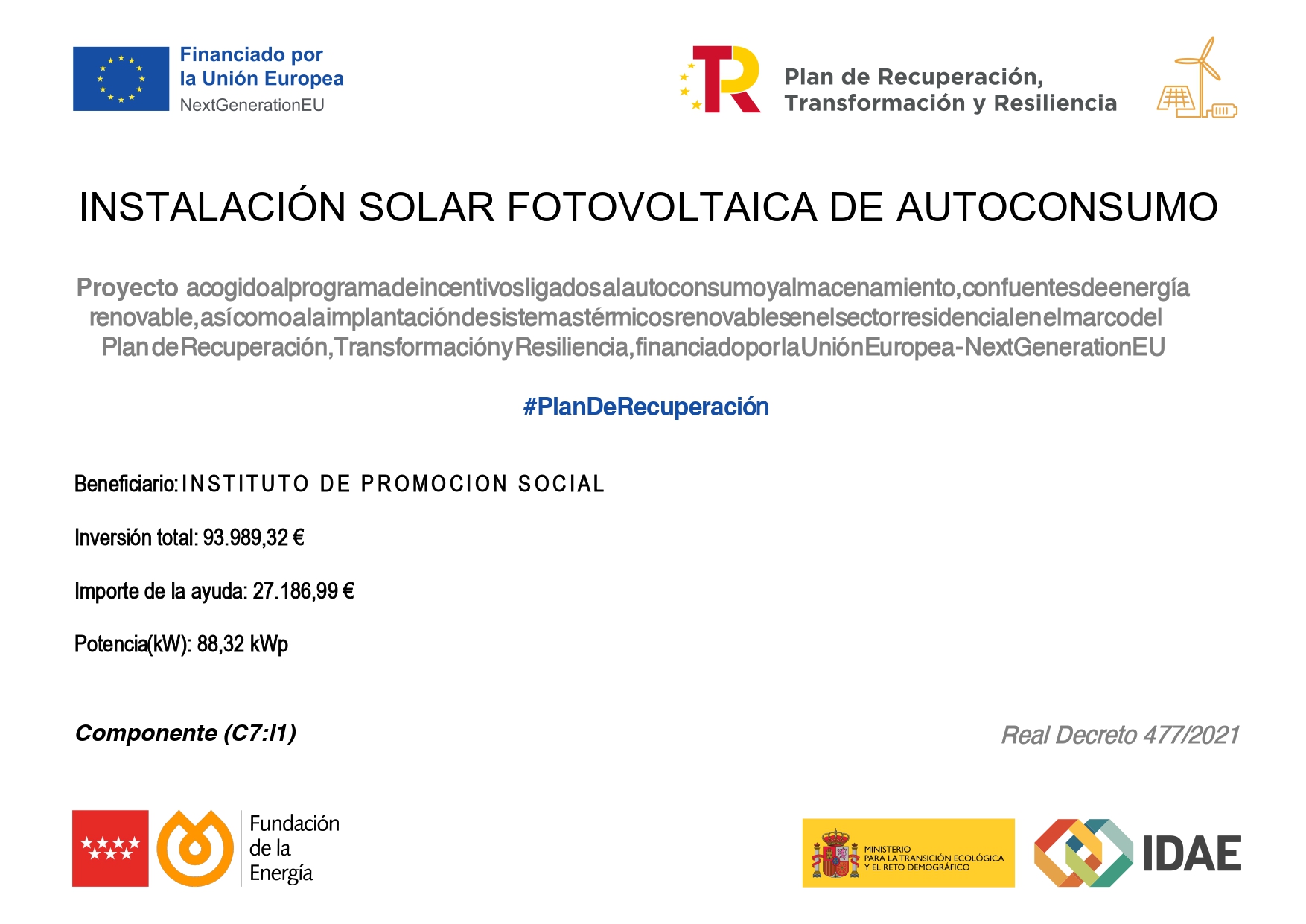 INSTITUTO DE PROMOCION SOCIAL ha instalado en la dirección dirección Calle de La Masó, 76 paneles fotovoltaicos con una potencia total instalada de 88,32 kWp, financiadas por la Unión Europea con cargo al Fondo NextGenerationEU, en el marco del Plan de Recuperación, Transformación y Resilencia, en colaboración con el ministerio para la Transición Ecológica y el Reto demográfico, a través del IDAE y a la Consejería de Desarrollo Sostenible, a través de la Fundación de la energía de la Comunidad de Madrid